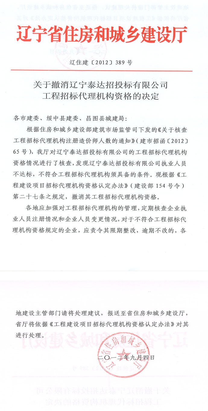 【概要描述】关于撤销辽宁泰达招投标有限公司工程招标代理机构资格的决定